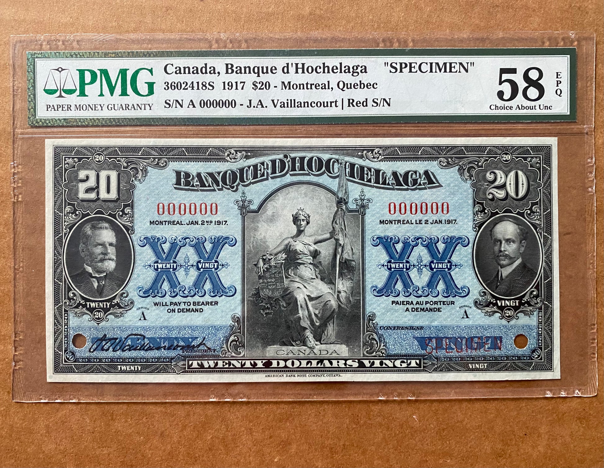 1917 BANQUE D’HOCHELAGA $20 “SPECIMEN” NOTE - PMG GRADED AU-58: 000000